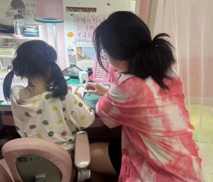 下午,陽光熾熱。侯同學在家中耐心為妹妹輔導功課,桌上堆滿書本筆記。她說高考后的暑假要幫妹妹進步,這是她為家做的貢獻。輔導過程有困難,可看到妹妹成績提升,一切都值。她期待大學充實自己,更好照顧家人。