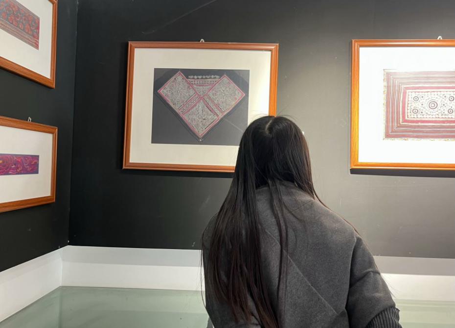 隨后,實踐隊參觀了苗繡展示館,被館內100余件跨越百年的繡品深深震撼。這些繡品中,蝴蝶媽媽、楓樹圖騰等高頻紋樣暗合黃金分割比例,不僅展現了苗繡文化的深厚底蘊,還通過與現代服飾和文創產品的融合,使這一古老技藝煥發出新的生機。在苗繡車間,實踐隊員們化身“學徒”,親身體驗苗繡制作過程,深刻感受到苗繡技藝的精湛和苗族文化的獨特魅力。同時,還了解到工坊引入的數字化技術為苗繡產業的創新發展提供了有力支撐。