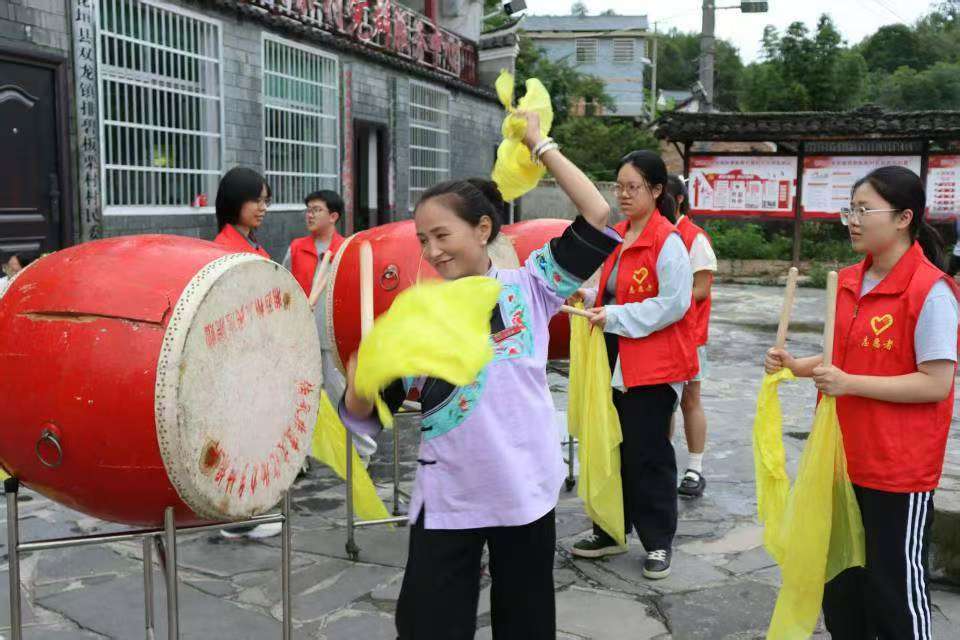 (圖2:團隊成員學習如何打苗鼓)本次實踐活動讓學生們親歷非遺活態傳承現場,拉進了與苗族非遺文化的距離。“每個動作、每段歌詞都是活著的文化教科書,本次實踐活動讓學生們切身了解了非遺文化傳承”,團隊成員胡旭馨表示。支部將整理拍攝的影像資料制作教學視頻,通過新媒體平臺推廣苗族文化藝術,讓更多的人認識和了解苗鼓苗歌文化。湘大學子正以當代視角探索傳統文化傳播新路徑,為非遺保護書寫青春的注腳。