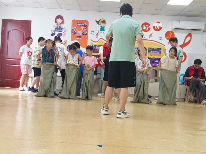 “兩人一足”項(xiàng)目中,布帶將孩子們的腳踝相連,他們努力協(xié)調(diào)步伐,從最初的踉蹌逐漸走向默契,如同跳起成長(zhǎng)的“雙人舞”。“袋鼠跳”環(huán)節(jié),孩子們鉆進(jìn)麻袋奮力蹦跳,靈動(dòng)的身影展現(xiàn)著拼搏與歡樂(lè),志愿者們也加入其中,共同體驗(yàn)運(yùn)動(dòng)的樂(lè)趣。“丟手絹”游戲則將氣氛推向高潮,歡快的追逐與歌聲、笑聲在場(chǎng)地中回蕩。