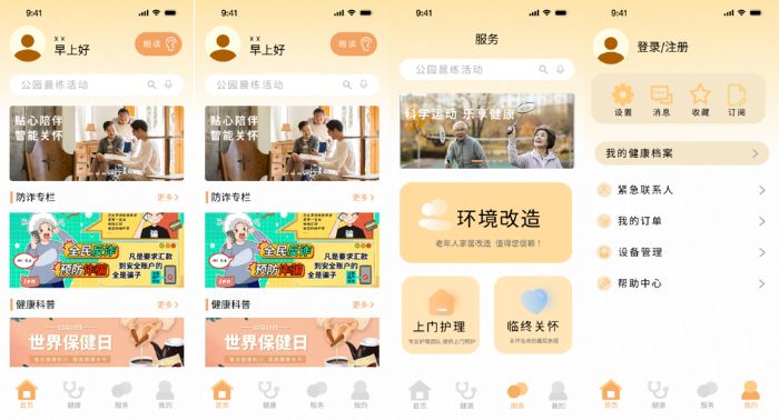 首頁的主要內容區域由精選資訊、養老科普、防詐騙專題等板塊組成。精選資訊涵蓋老年人關心的健康、政策、生活服務等內容,幫助用戶及時獲取有價值的信息。養老科普版塊則針對老年群體的生活需求,提供實用的護理知識、心理健康建議等。防詐騙專題聚焦老年人常見的電信詐騙案例,通過圖文結合的方式,提高用戶的防范意識,增強安全保障。