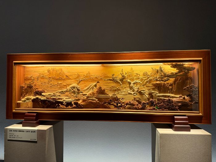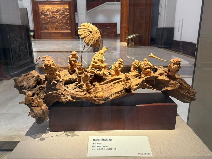 進入中國木雕博物館,映入眼簾的是一幅描繪中國長城的木雕作品。館內明亮通透,設有六個展廳——歷史廳、生活廳、大師廳、世界廳、竹藝廳及家訓館。一樓還設有許多玻璃木雕館藏。