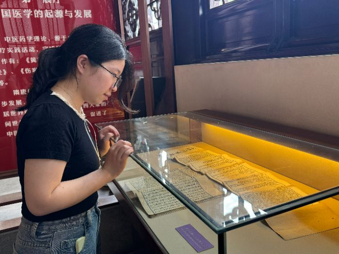 步入古樸典雅的蘇式建筑,跨過青石地袱的高聳門檻,團隊成員首先來到第一展廳。在這里,大家系統回顧了中醫學的起源與發展脈絡,并有幸鑒賞到《儒門事親》等珍貴古籍的手抄真跡。隨后,團隊移步第二展廳。該展廳聚焦展示了吳醫的演進歷程:吳地早期醫學以道家思想為根基,至金元時期,在劉完素、張從正等醫家學術思想的影響下,逐步形成了獨具特色的“吳門醫派”。明清時期,吳中醫學迎來全盛發展階段,呈現出世醫傳承有序、儒醫群體崛起、醫學著作紛呈的繁榮景象,更孕育出了影響深遠的“溫病學派”。