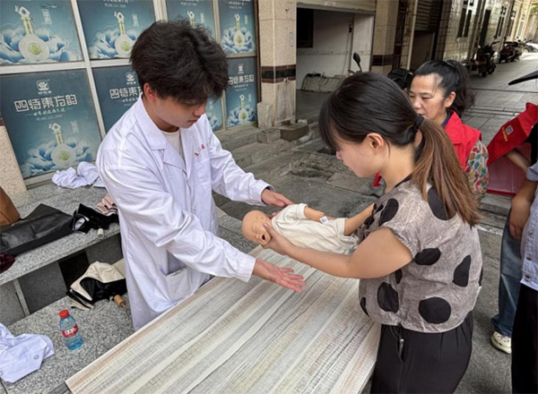 實踐隊隊員方軼濤為巴厝村村民示范嬰兒海姆立克法