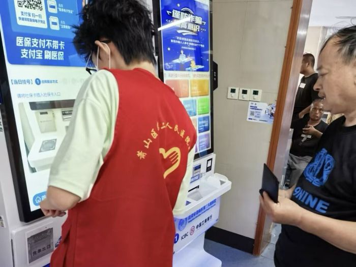 圖為實(shí)踐團(tuán)于浙江省杭州市蕭山區(qū)第二人民醫(yī)院幫助老人使用自動(dòng)掛號(hào)機(jī)。施佑霖 供圖