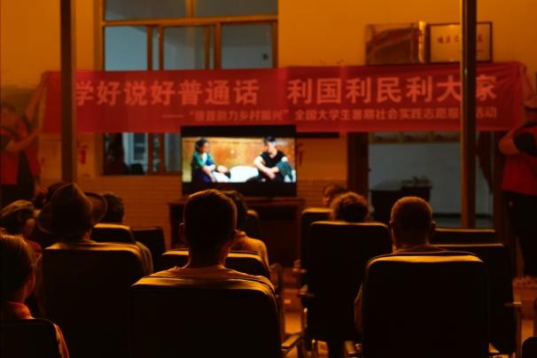 觀影期間,實踐團成員趁熱打鐵開展推普宣講。宣講以“普通話如何助力鄉村振興”為主題,結合電影情節與當地案例,生動闡釋了普通話在促進農產品外銷、吸引外來投資、提升村民文明素養等方面的關鍵作用。“原來學好普通話,不光能方便交流,還能幫咱把土特產賣得更遠!”村民們紛紛表示,將主動學習普通話,用語言鑰匙打開致富之門。