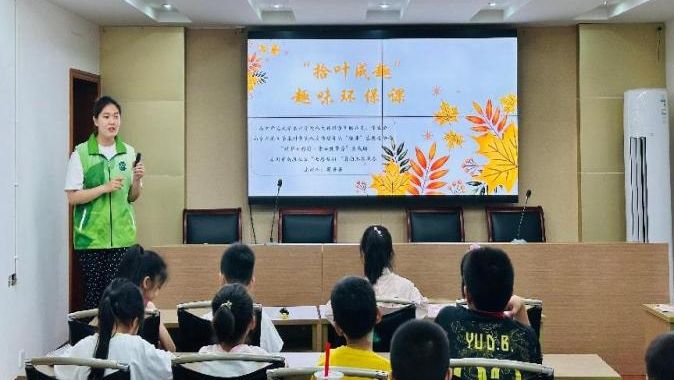實踐成員顧暑暑開啟“拾葉成趣”環保藝術課,帶領同學們用落葉進行創意創作。課程伊始,一段展現秋日繽紛落葉的視頻,瞬間將同學們帶入奇妙的自然世界,也點燃了同學們對樹葉貼畫的期待。她展示了親手制作的樹葉貼畫范例,并通過課件呈現更多優秀作品,引導同學仔細觀察樹葉的形態與色彩,感受自然素材與藝術碰撞的奇妙。
