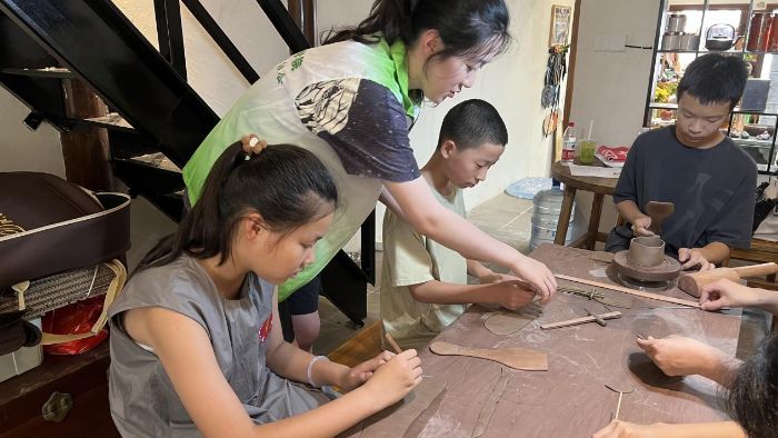 7月15日,我們轉場丁蜀鎮古南街,開啟紫砂非遺探秘之旅。青石板路蜿蜒,紫砂壺的韻律在空氣中流淌。我提前聯系紫砂非遺傳承人丁女士,為孩子們準備了紫砂泥與工具?;顒又?,我給小朋友們展示了各種類型的紫砂壺,講述紫砂從礦石到藝術品的蛻變。在制作環節,我悄然蹲下,與孩子們并肩,與非遺傳承人一起耐心指導他們“拍打泥片、塑造身筒”。面對一個小男孩因泥料干裂而顯露出的失落,我遞上一塊濕潤的毛巾,溫言細語:“紫砂需歷經千錘百煉,千度烈火方能成器,正如我們面對挑戰,決不輕言放棄。”最終,孩子們捧著歪歪扭扭卻獨一無二的“處女作”,臉上洋溢著自豪。這一刻,我忽然明白:文化傳承的種子,正是在這樣笨拙卻真誠的觸摸中悄然萌芽。