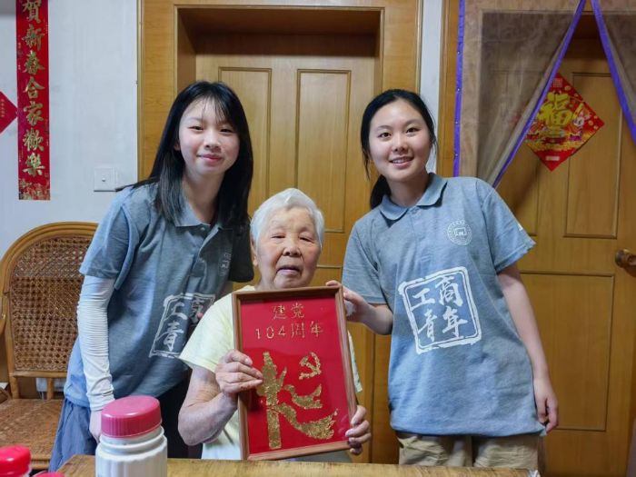 在喜迎中國共產黨成立104周年之際,為賡續紅色血脈,弘揚尊老敬老傳統美德,彰顯新時代青年的責任擔當,6月30日下午,由浙江工商職業技術學院經管學院社工專業學子組成的“暖夕志愿服務隊”,帶著節日的祝福與青春的活力,再次走進新典社區,以一場融合“紅色傳承”與“專業為老”的金箔畫創作活動,為空巢獨居長者送上節日溫情,也上了一堂生動的實踐黨課。