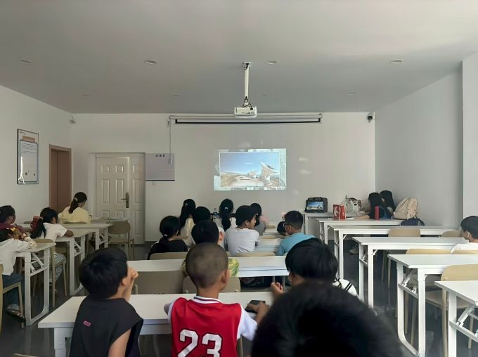 英語課堂則變身為充滿魔力的語言游樂場。漫長的暑期并未冷卻孩子們對知識的渴求。“單詞尋寶”引爆了全場的熱情。小小的活動室瞬間變成神秘的探險叢林。孩子們?nèi)耸忠粡埦€索卡,像機敏的小偵探,貓著腰穿梭在桌椅的“森林”間。一個穿藍色T恤的小男孩屏住呼吸,小心翼翼地翻開桌墊一角,當“apple”的卡片赫然出現(xiàn)時,他興奮得小臉通紅,高高舉起卡片,雀躍地大喊:“我找到蘋果啦!”不遠處,另一個小女孩對著“zoo”的圖片恍然大悟,激動地拍著手:“動物園!好多動物!”每一次發(fā)現(xiàn)都伴隨著驚呼和純真的笑臉,那是探索未知、收獲新知最純粹的喜悅。