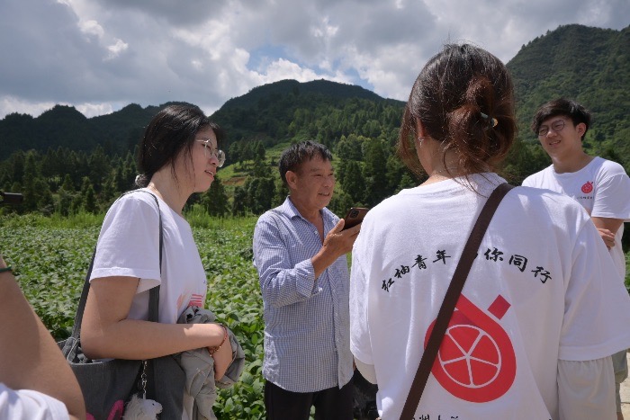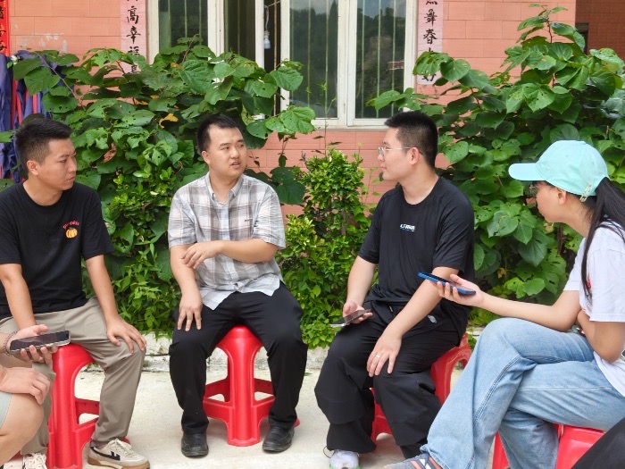 基地考察后,團隊轉赴小關村與村書記展開座談。村書記展開一幅“產業(yè)地圖”:“全村800多戶中超500戶種植山銀花,大部分生花由本地十多家加工廠收購,成品主銷成都、長沙藥材市場。”面對價格波動,村里通過合作社引導農戶精細化采摘,并全力打造“朵花”自有品牌以提升附加值。他還提及采摘季勞動力緊張時需外調人手,以及結合避暑季探索“金銀花+民宿”文旅路徑的初步設想,讓游客帶走的不只是產品,更是山野記憶。訪談尾聲,書記拍拍團隊成員的肩膀,笑著說道:“我們非常歡迎也非常感謝大學生們來‘三下鄉(xiāng)’調研,運用你們的所學知識調查產業(yè)發(fā)展實際情況、提出切實可行建議,并且為山銀花產業(yè)發(fā)展做宣傳。”