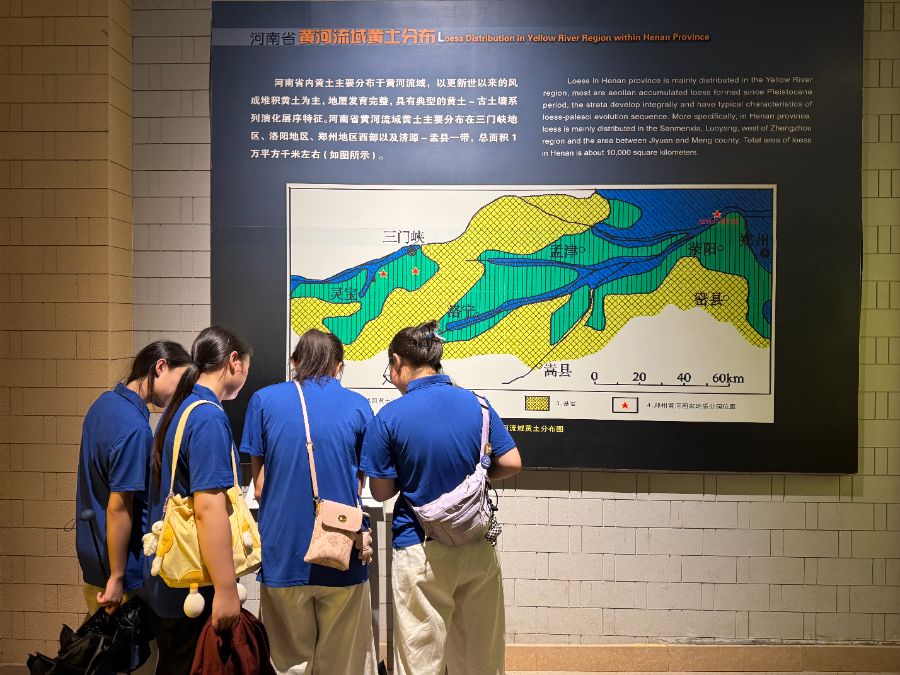 團隊成員們還參觀了黃河地質(zhì)博物館。這座博物館猶如一部無聲的黃河地質(zhì)史書,館內(nèi)陳列著豐富的地質(zhì)標(biāo)本和詳實的圖文資料,館內(nèi)包含了多個主題展廳,系統(tǒng)地展示了二百六十萬年來黃河、黃土以及黃淮平原的形成與演變歷程,通過豐富的地質(zhì)標(biāo)本、地貌模型和古土壤序列,借助獨特的窯洞設(shè)計、豐富的館藏、現(xiàn)代化的科技互動手段,以及系統(tǒng)性的展廳布局,將黃河、黃土、黃淮平原的宏大故事與細(xì)微奧秘娓娓道來。大家時而駐足觀看,時而熱烈討論,在知識的海洋中汲取著黃河地質(zhì)文化的養(yǎng)分,深入了解了黃河地質(zhì)變遷的奧秘。