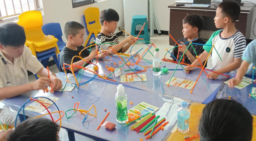 圖為小朋友們開始使用吸管玩具來搭建作品。周明杰攝