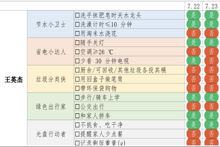 為推動環(huán)保從“知識”到“行動”落地,小分隊推出“環(huán)保打卡”活動,設(shè)計節(jié)水、節(jié)電、垃圾分類、綠色出行等打卡任務(wù)。學生們積極參與,洗手及時關(guān)龍頭、用淘米水澆花、步行上學、光盤行動……一張張打卡表,記錄著日常環(huán)保實踐。