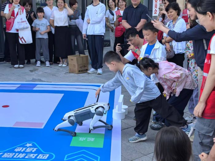 儀式現場,一只由山東大學自主制造的四足機器人成為了“明星”。在操作員的嫻熟操控下,這只“機器狗”靈活地完成了打招呼、跳躍、后空翻等一系列高難度動作,引得在場眾人紛紛駐足圍觀、拍照留念。孩子們更是按捺不住好奇心,小心翼翼地靠近與它互動,這讓孩子們近距離感受到了科技的魅力。
