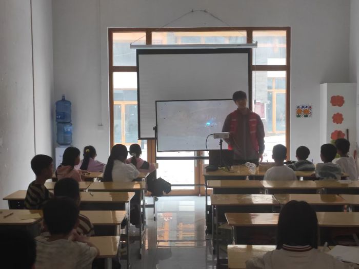 上午,“七彩假期”系列專題課之“美麗家園我行動”開課。支教隊員林芷妍站在講臺上,望著臺下眼神明亮的孩子們,以“我們身邊有哪些自然朋友?又有哪些環境小麻煩?”的提問拉開序幕。話音剛落,孩子們的小手便如雨后春筍般舉起,“有河流、森林!”“塑料袋會污染土地!”稚嫩的聲音此起彼伏,瞬間點燃課堂氛圍。隨后,一段5分鐘的動畫視頻生動演示了廢紙如何變成再生紙、廢塑料如何化身花盆,孩子們瞪大眼睛,不時發出“原來垃圾還能變寶貝”的驚嘆。