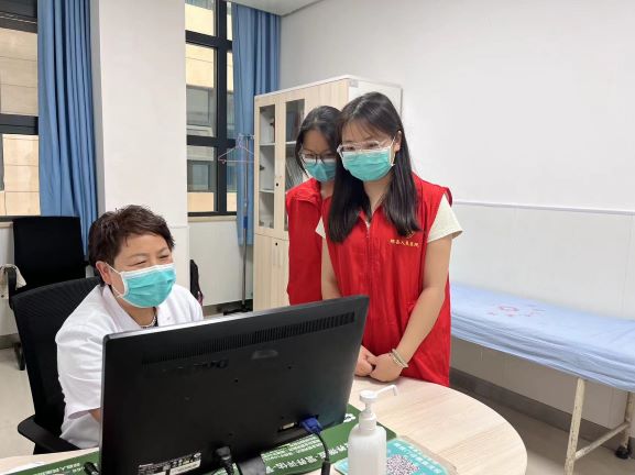 學習結束后,同學們沒有停歇,而是立刻投身到志愿服務中。他們在醫院的門診大廳設置了宣傳點,向過往的患者和家屬發放心肺復蘇宣傳資料,并現場演示心肺復蘇的操作方法。