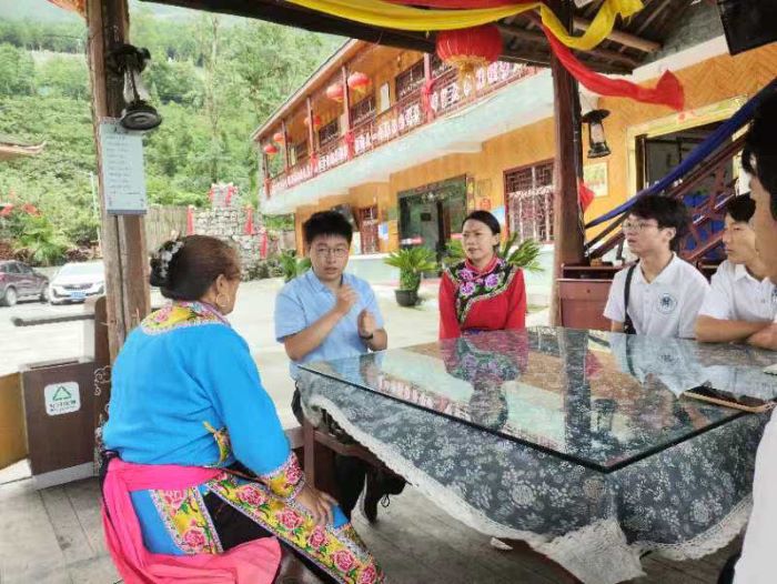 團隊成員與石椅村黨支部副書記陳艷進行了深入交流,在交流中團隊成員們了解到,石椅村充分依托特色水果、自然生態和羌族文化,推進基礎設施建設,發展鄉村旅游。例如,村里成立了水果專業合作社,統一管理和銷售;與綿陽市農業科學研究院合作,提高水果種植技術;開發柳杉林,打造“林海石源”、茶研綜合體等項目。同時,石椅村依托其豐富的旅游資源和獨特的民族文化,石椅村開發了多種旅游產品和服務,如羌族歌舞表演、農家樂體驗、特色民宿等。這些項目不僅吸引了大量游客前來游玩,也為村民提供了更多的就業機會和收入來源。
