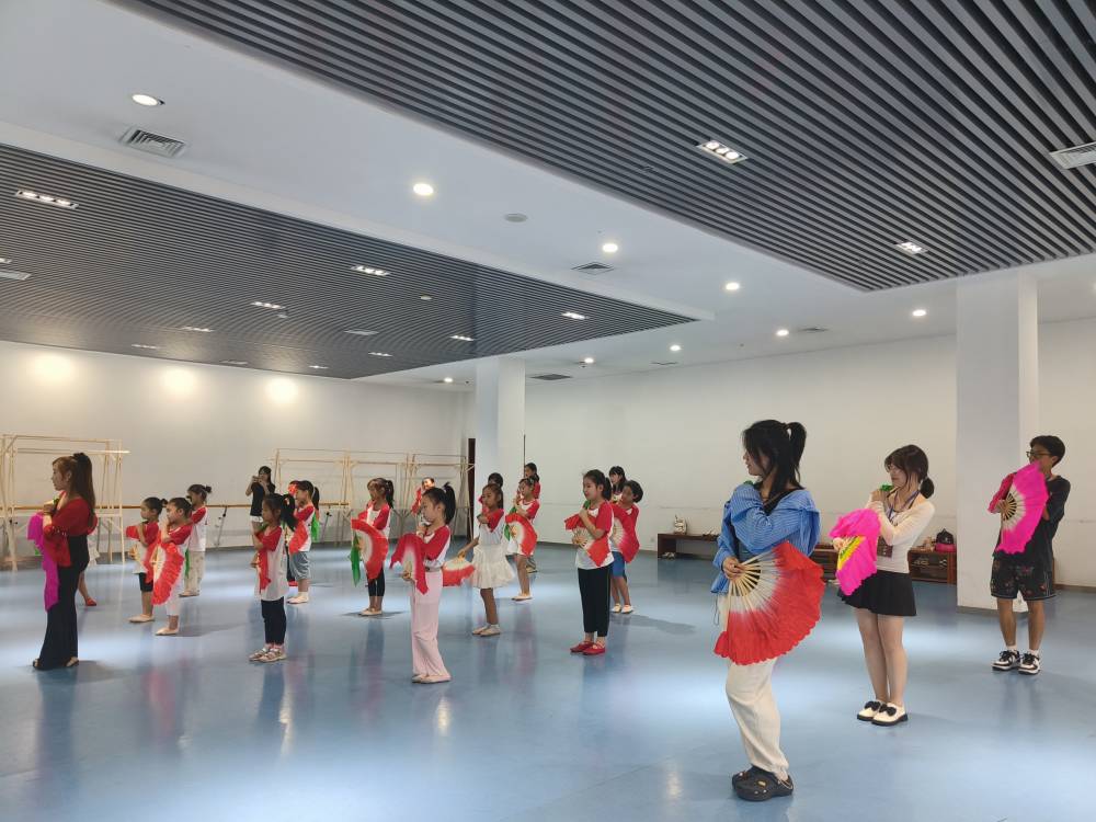 調研過程中,實踐隊隊員有幸在李老師的指導下與孩子們共同學習,了解到了膠州秧歌的基本體態、基本腳位與持扇方法,以三彎九動十八態的風格動律展現舞蹈動態過程中力的延伸之美。李老師指出,膠州秧歌強調“三道彎”的體態特征,同時腳呈丁字位,主要體現在動態流動過程和靜態舞姿中,以動力腳為支點帶動腰及上身各部位的扭動,形成流動中“三道彎”的曲線特征狀態和擰腳、讓胯,略腆腮的“三道彎”形態。通過此次細致的學習,實踐隊成員們感受到了地地道道的秧歌舞蹈,體悟其內在精髓。