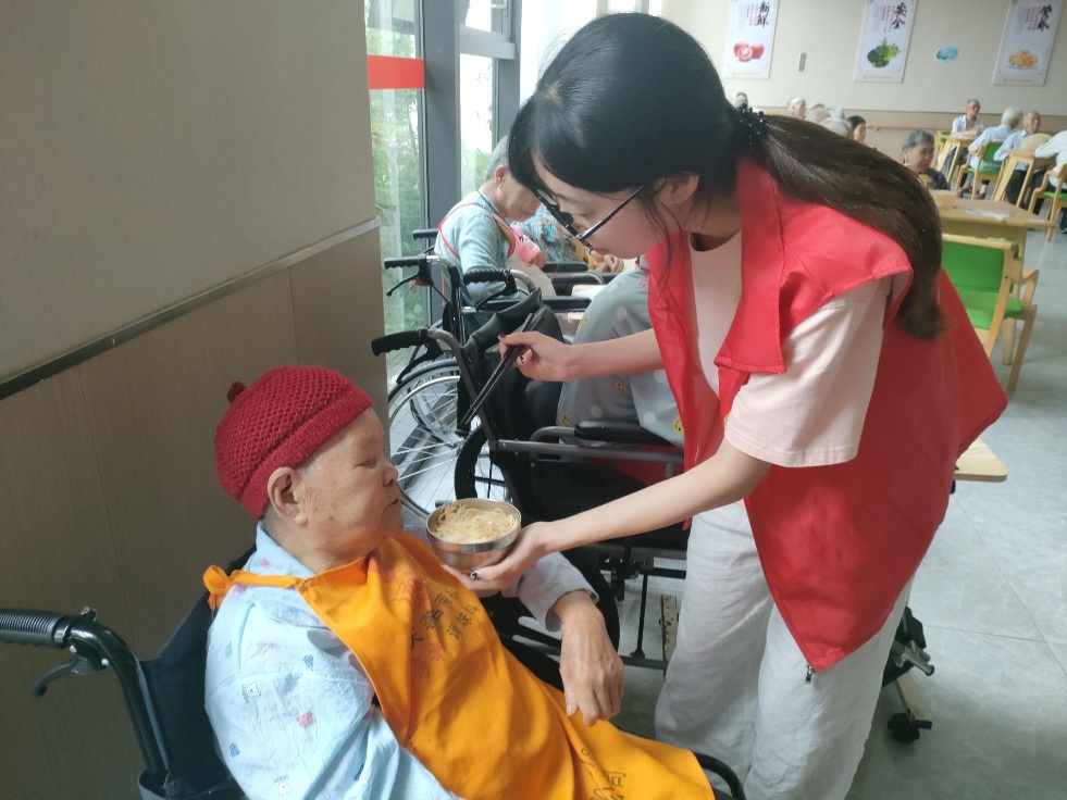 圖為志愿者幫助老人吃飯,文隆妹攝