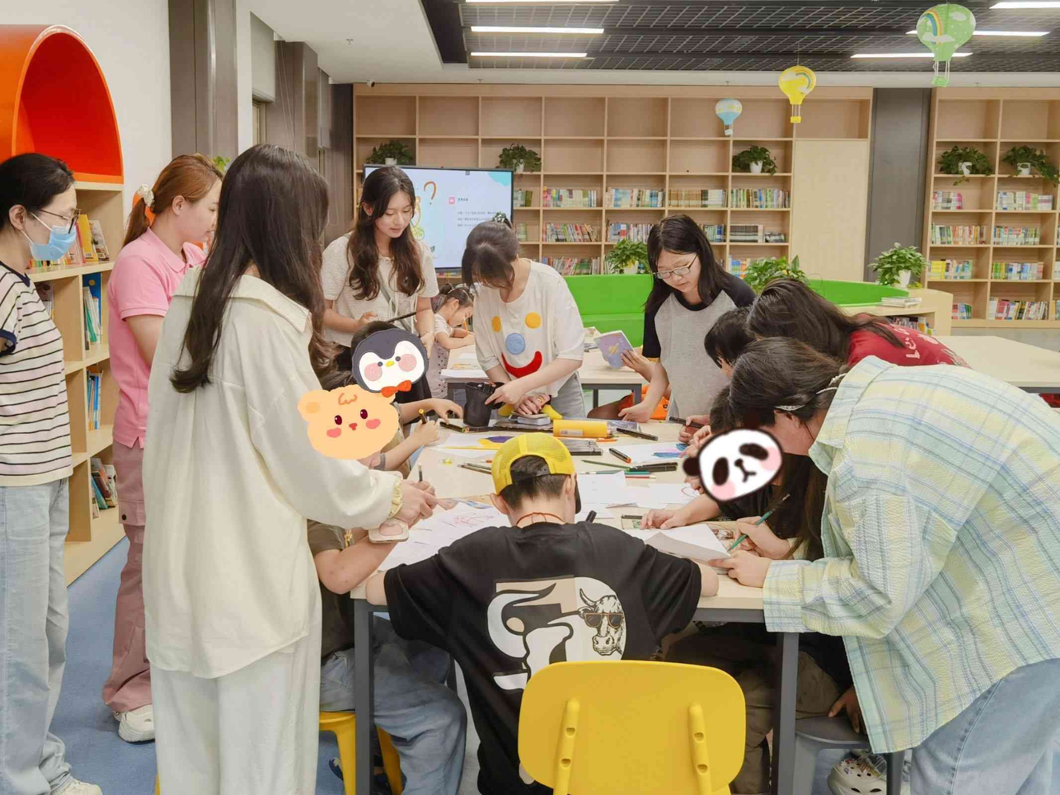 圖書館概覽結束后,實踐團成員帶領孩子們前往兒童閱覽室進行主體活動。團隊成員曾子怡針對孩子們的閱讀特性與心理狀況,創造性地將情緒認知、閱讀習慣培養與繪畫表達結合,為孩子們上了一節生動有趣的融合課程。課堂中曾子怡向孩子們介紹了八種基本情緒,讓孩子們對自身日常中所表達的情緒有了更深的理解。在課堂結束后舉辦的“情緒大冒險”環節中,實踐團成員鼓勵孤獨癥孩子們與其他讀者孩子們一起分享自己的情緒體驗經歷,鍛煉孤獨癥兒童的社會交際能力,提升其適應陌生環境的能力,為其搭建融入社會的橋梁。