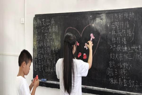 值得一提的是,為了讓學生親身體驗參與預防艾滋病的過程,志愿者組織學生制作象征艾滋病防治的紅絲帶。盡管面臨物資限制,學生們利用紅紙精心制作紅絲帶,對此活動表現出了極高的參與熱情。活動后期,孩子們親手將自己制作的紅絲帶粘貼在教室黑板上繪畫的愛心圖案中。一方面這一舉動體現了他們對艾滋病的深刻理解與關注,展現了他們關愛他人、尤其是艾滋病毒感染者和患者的溫暖情懷。這反映了孩子們在情感與認知上的成長,通過實際行動傳遞了對受影響群體的支持與接納,同時也增強了孩子們的社會歸屬感和自我價值認同。另一方面志愿者希望通過這次活動深入普及艾滋病防治意識和深切關懷弱勢群體。通過這樣的互動,志愿者們用自己的行動示范了社會責任感,同時也為孩子們樹立了正面的榜樣,讓他們在實踐中學會尊重生命、關愛他人,進而促進了整個社會對艾滋病感染者和病人的接納和支持。