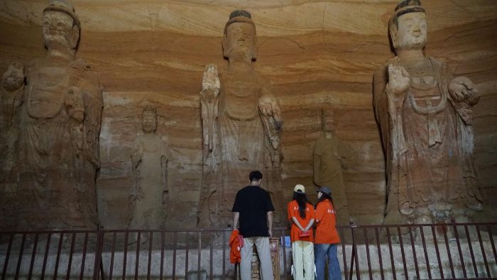 作為古絲綢之路東段的重要遺址,王母宮石窟的造像中還能看到多元文化交融的痕跡——佛像的發髻樣式、衣飾褶皺中,既有中原傳統雕刻的細膩,又隱約可見西域藝術的豪放。團隊成員在講解員的指引下,仔細辨認著這些文化交流的“密碼”,深刻體會到石窟作為文明對話載體的獨特價值。窟內設置的溫濕度傳感器、小型除濕設備等現代化保護設施,也讓大家直觀感受到科技在延緩文物老化中的作用,對“保護為先”的理念有了更具體的認知。