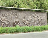 泗縣烈士陵園莊嚴肅穆,園內蒼松翠柏,郁郁蔥蔥。踏入陵園,便能看到彭雪楓烈士的雕像巍峨聳立,其堅毅的目光仿佛仍在注視著這片他曾為之奮斗的土地。一旁的雕墻更是令人震撼,浮雕墻以精湛的技藝生動展現了彭雪楓將軍率領千軍萬馬馳騁疆場的豪邁場景。彭雪楓將軍被刻畫得栩栩如生,騎在戰馬上指揮若定,眼神堅定而銳利,透露出無畏的勇氣和決心。在他的周圍,戰士們緊跟其后,或沖鋒陷陣,或奮勇殺敵,展現出頑強的戰斗精神和團結協作的力量。背景中的硝煙彌漫、戰火紛飛,烘托出緊張激烈的戰斗氛圍。浮雕墻的細節處理十分精致,清晰地呈現出戰士們的各種姿態、武器裝備以及面部表情,使人們能夠感受到他們的熱血與激情。同時,浮雕墻也通過高山、黃河、青松等象征元素寓意著彭雪楓將軍崇高的革命氣概。