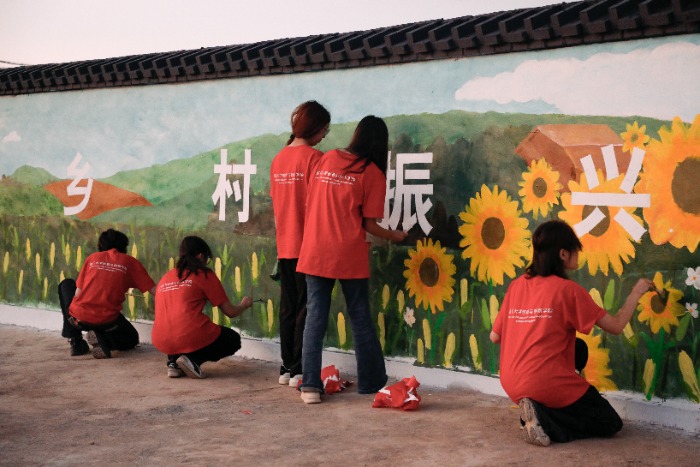廈門大學實踐隊繼續緊扣五寨縣"黃金玉米帶"地域特色,在孫家坪富康新村完成了以玉米產業為主題的鄉村振興墻繪。畫面以金燦燦的玉米田為主,作品特別突出了五寨甜糯玉米"粒粒晶瑩、口口香甜"的獨特品質,通過藝術手法展現了"小玉米"撬動"大產業"的振興之路。實踐隊員們用畫筆詮釋了"產業興則鄉村興"的發展理念,既彰顯了五寨縣打造特色農產品優勢區的成效,也描繪了農業強、農村美、農民富的美好未來。
