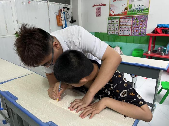 圖為實(shí)踐隊(duì)員輔導(dǎo)學(xué)生寫(xiě)作業(yè)。張志恒 供圖