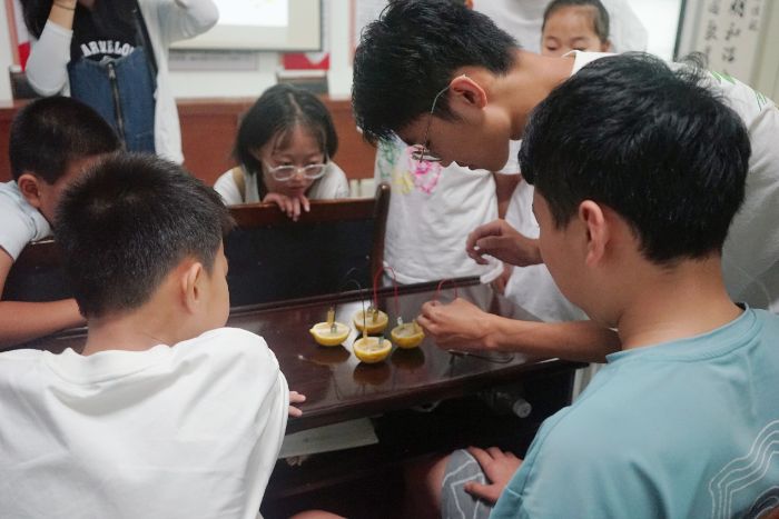 科普環(huán)節(jié)后,實(shí)踐團(tuán)帶領(lǐng)同學(xué)們動(dòng)手進(jìn)行檸檬發(fā)電實(shí)驗(yàn)。成員們提前準(zhǔn)備好材料,耐心指導(dǎo)大家按步驟操作。當(dāng)看到小燈泡在檸檬的“驅(qū)動(dòng)”下亮起時(shí),同學(xué)們紛紛發(fā)出驚嘆。實(shí)踐團(tuán)成員趁機(jī)講解原電池的工作原理,讓抽象的科學(xué)知識(shí)在趣味實(shí)驗(yàn)中變得易懂。