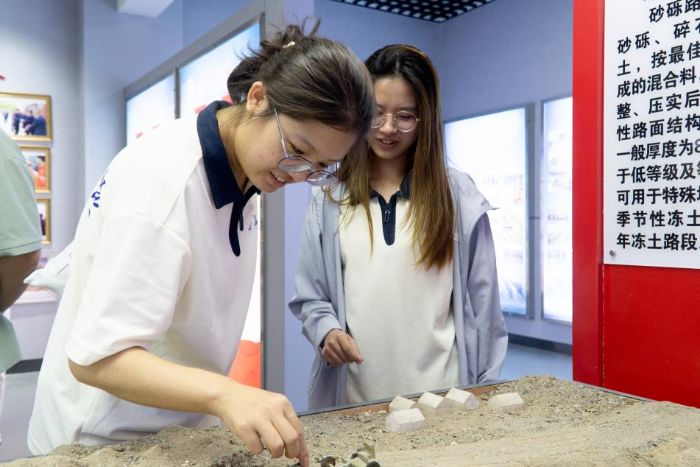 圖為實踐隊成員體驗公路文化展示館沙盤模型