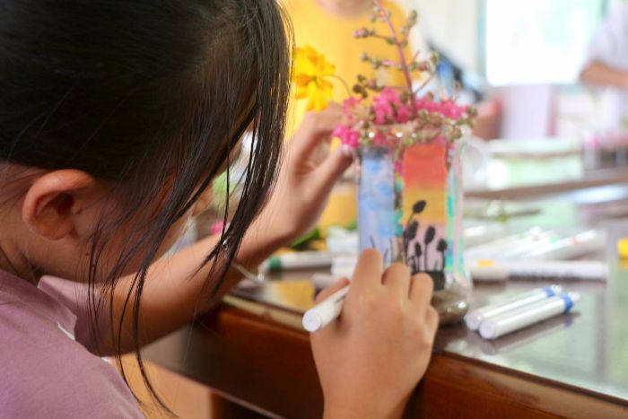 圖為小朋友繪制“生態(tài)瓶”花盆