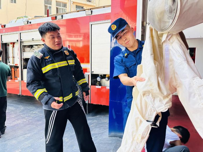活動伊始,消防大隊的隊長熱情迎接了實踐團成員和孩子們。在隊長的引領下,大家首先來到消防車庫。車庫中整齊停放著各種型號的消防車,它們宛如一個個威風凜凜的“鋼鐵戰士”。隊長用標準的普通話詳細介紹了每輛消防車的名稱、功能、操作方法以及隨車配備的各類消防器材。孩子們滿懷好奇,全神貫注地聆聽講解,還不時用普通話向隊長發問,隊長都耐心地一一解答,現場氣氛十分活躍。