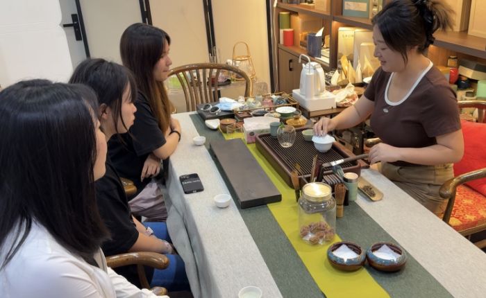 文化賦能,助力茶產業升級 7月25日,團隊來到茶藝館學習茶道文化。茶藝老師趙璐屹從陸羽《茶經》講起,手指輕撫茶席上的白茶:"德旺鄉的白茶,芽頭肥壯,白毫顯露,就像穿著銀紗的苗家姑娘。"她嫻熟地溫杯燙盞,一邊演示一邊解說,"看這茶葉在水中舒展,先浮后沉,就像鄉村振興的過程,需要沉淀和耐心。"