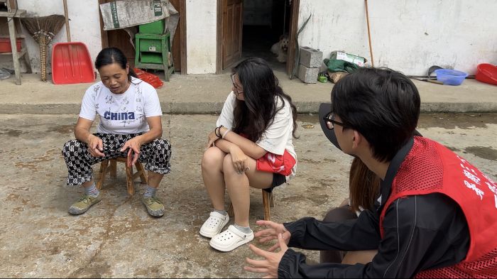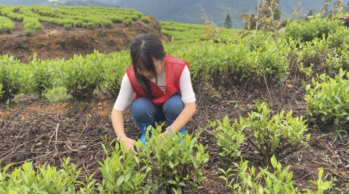 田間勞動,體驗茶農艱辛 7月21日清晨,隊員們跟隨茶農黎師傅走進茶園,學習除草、松土、施肥等技術。“淺耕保墑要掌握2-3厘米深度,太深傷根,太淺沒效果。”隊員們學著他的樣子,彎腰在茶樹間穿梭。汗水很快浸透了后背,指尖沾滿泥土的芬芳。不知何時,幾位苗族阿姐也加入了勞作的隊伍。休息時,她們唱起悠揚的苗歌,歌聲像山澗清泉般流淌。雖然聽不懂歌詞,但隊員們不約而同地跟著節奏輕輕搖擺。陽光下,不同民族的笑臉一樣燦爛,歌聲在山谷間回蕩,驚起一群飛鳥。這一刻,語言不再是隔閡,茶香與歌聲成了最動人的紐帶。