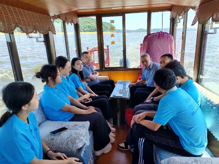 (團隊成員與相關領導在龍山風水庫游湖并就相關問題進行交談)