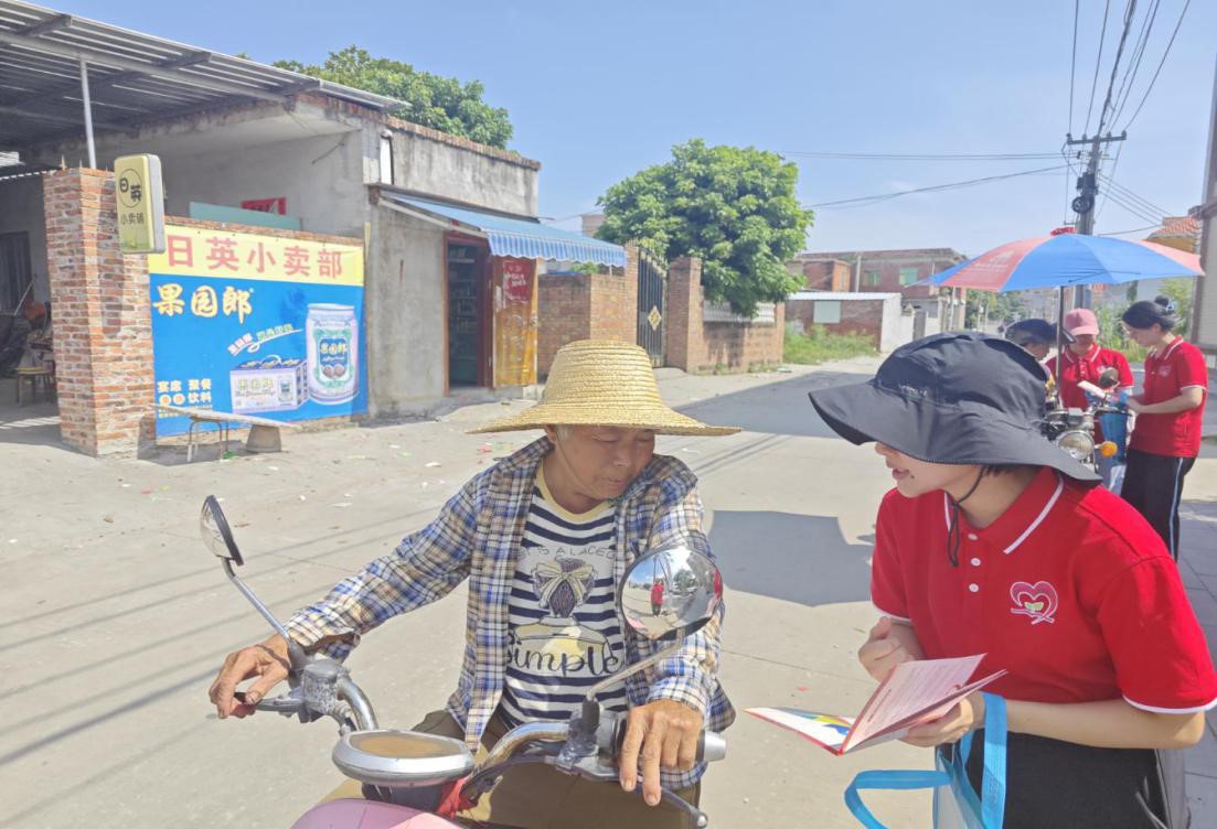 除此之外,隊員們依托田頭圩內主干道這一村民日常出行的重要路徑,開展流動宣講活動。隊員們沿著主干道緩慢行進,通過吆喝資助政策要點,同時隨手配備宣傳資料,向過往村民面對面講解資助范圍、申請條件、辦理流程等內容,讓惠民政策更直接、更便捷地觸達每一位村民。遇到街邊納涼的胡姨,我們主動遞上《廣東省學生自主政策簡介》,簡單講解“獎、貸、助、勤、免、補”等八大資助政策。胡姨表示:“這國家政策好啊,正好我們家里出了兩個大學生,我和他們說啊。”