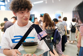 下午3時,實踐團隊在博物館周邊的文化廣場開展紫砂文化互動宣傳活動。廣場上,團隊派出代表擔任主持人,隨機邀請路過的游客參與到我們的互動中來,“對紫砂壺的了解程度有多少?”“是什么原因促使你來到這里?”“對于紫砂文化的傳承你有何看法?”等問題引發不少游客的關注,興趣高漲,與此同時對于積極參與問答的游客,團隊送出自己精心制作的紫砂壺Q版人物吧唧等文創周邊,也供游客免費領取或低價購買,起到很好的宣發作用。