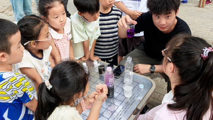 同一時間,南湖公園的實踐現(xiàn)場同樣熱鬧非凡??茖W實驗臺前圍坐著一群眼睛發(fā)亮的小朋友,實踐隊員們變魔術般地展示著健康科學小實驗。"看好了,見證奇跡的時刻到啦!"隨著隊員將維生素C倒入棕黃色的碘伏溶液,液體就像被施了魔法般漸漸變得透明。"這就像我們身體里的小衛(wèi)士在工作,"隊員蹲下身來,用孩子們能理解的語言解釋,"它們每天都在把對身體不好的東西變成好東西。"
