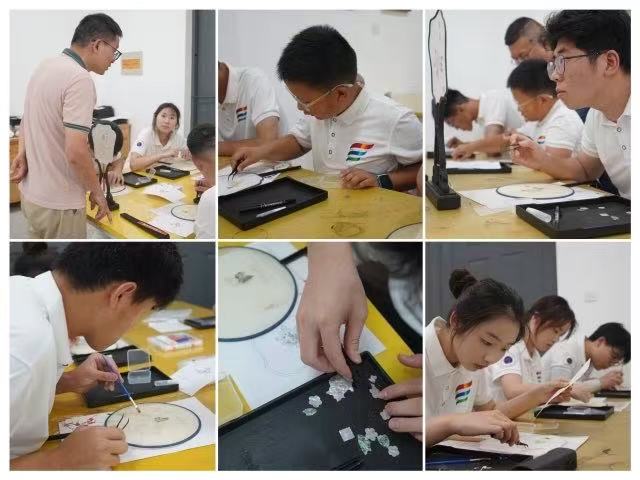 隨后,實(shí)踐團(tuán)前往制作車間,近距離觀摩螺鈿漆扇全流程制作。匠人們專注于每道工序——切割、打磨、髹漆、鑲嵌,每一步都凝聚著技藝積淀與文化精神。作為揚(yáng)州漆器代表性技法,螺鈿工藝以珍珠貝、云母等天然材料為原料,磨成薄片后按圖案精準(zhǔn)切割,再鑲嵌入漆面,呈現(xiàn)出熠熠生輝的畫面。工作人員一邊操作一邊講解:“切割要穩(wěn),鑲嵌要準(zhǔn),哪怕一點(diǎn)偏差,整體美感就會失衡。”