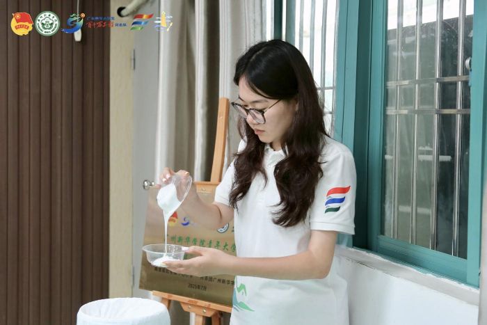 制作紙漿時,突擊隊隊員戴小雨跟同學們講解,“不同顏色的紙漿要分開存放,尤其是深色和淺色,否則容易串色,影響圖案的清晰度。” 她還示范了膠水的添加比例,當膠水與紙漿的比例大概在 1:5時,既能保證粘性,又不會讓作品干后起皺。” 孩子們聽得專注,時不時點頭回應,手上的動作也更加謹慎。