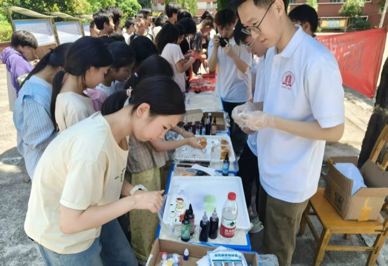 活動當(dāng)天,老城鎮(zhèn)初級中學(xué)操場變身成為非遺文化展示的舞臺。實踐團隊精心設(shè)置了漆扇制作、書法體驗、剪紙藝術(shù)、扎染工藝四大非遺體驗區(qū),每個區(qū)域都配備了專業(yè)指導(dǎo)教師和完備的制作材料。活動以“傳承非遺文化,助力鄉(xiāng)村振興”為主題,通過漆扇制作、書法體驗、剪紙藝術(shù)、扎染工藝等非遺項目,為鄉(xiāng)村學(xué)子帶來了一場別開生面的傳統(tǒng)文化盛宴。