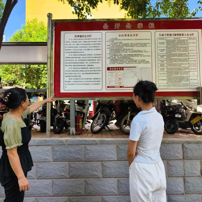 圖2 日照市嵐山區(qū)阿掖山花園社區(qū)干部向隊員介紹公示欄情況