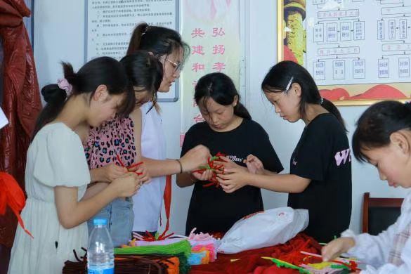 陳臺(tái)村的村委會(huì),一間不足60平米的屋子,成了實(shí)踐隊(duì)臨時(shí)的教學(xué)天地。在這里,5歲的孩童與17歲的高中生濟(jì)濟(jì)一堂,12個(gè)年級(jí)的認(rèn)知差異與“一室多用”的簡(jiǎn)陋條件,起初讓教學(xué)如同“一鍋燴”般難尋頭緒。但隊(duì)員們沒(méi)有退縮,立即調(diào)整課程,在方寸空間里開(kāi)辟出多元天地。從手工課、體育課、文化課再到課業(yè)輔導(dǎo),盛夏的蟬鳴聲中藏著鄉(xiāng)村少年最純粹的歡暢,知識(shí)也鉆進(jìn)孩子們的心里。此外實(shí)踐隊(duì)還與洛南縣圖書(shū)館取得聯(lián)系,聯(lián)合舉辦了“書(shū)香伴童行·支教獻(xiàn)真情”圖書(shū)分享活動(dòng),讓孩子們?cè)跁?shū)頁(yè)間觸摸更廣闊的世界。