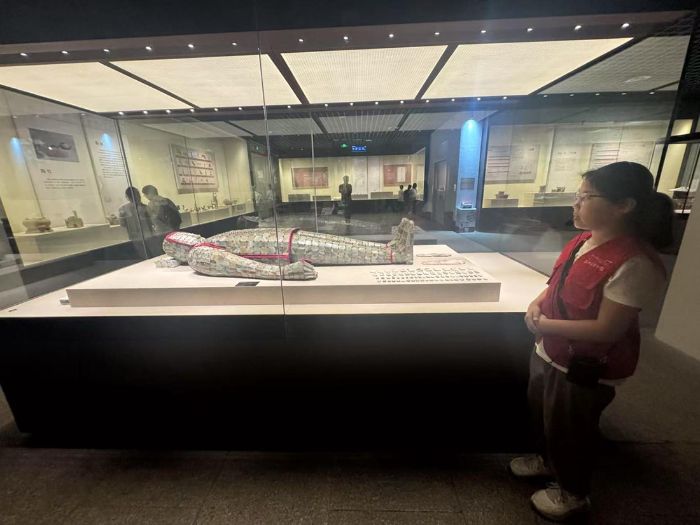 此圖為講解員為團隊成員介紹俑衣 魏彤彤供圖次日,“運河遺韻”展廳成為探索焦點。隋唐大運河柳孜遺址出土的瓷器碎片經修復后,青釉的瑩潤、白瓷的素凈在燈光下流轉,隊員對著展柜里的瓷瓶拍照:“這些瓷器跟著運河商船走遍南北,是淮北作為運河重鎮的見證。”展廳內的沉船殘骸、碼頭構件,更讓隊員們直觀感受到當年“舟楫塞港、商賈云集”的繁華,歷史的厚重在一件件文物中具象化。
