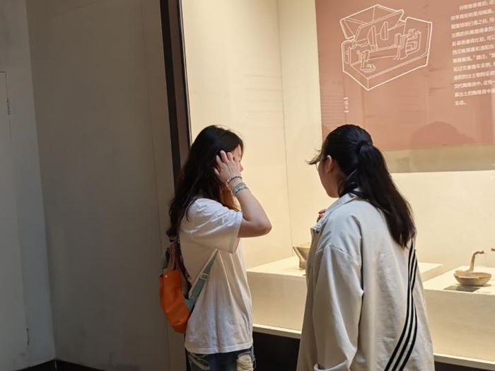轉過展柜,漢代陶制明器展區讓人眼前一亮。陶樓的飛檐雖已褪色,卻仍能想見當年的精巧;陶倉的圓形倉體,藏著古人對“倉廩實”的樸素向往。“這些不是簡單的模型,而是漢代人用泥土捏出的生活愿景。”一位隊員在筆記上寫下這句話時,指尖似乎觸到了陶土的溫熱。
