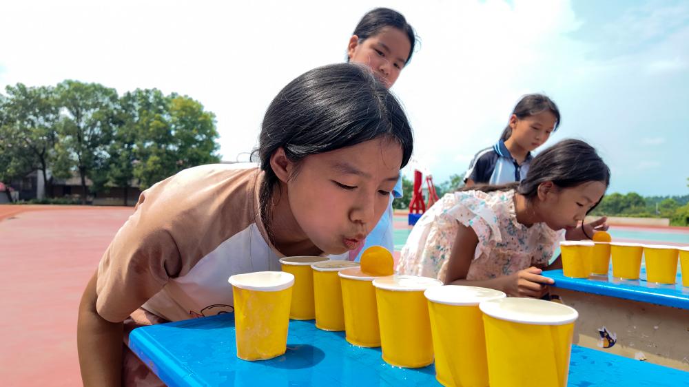 在跳繩項目中,孩子們像靈動的小鹿般輕快跳躍,繩子在他們腳下“嗖嗖”作響,伴隨著陣陣歡呼聲,展現出蓬勃的朝氣。吹乒乓球項目更是趣味十足,多個裝滿水的紙杯連續擺放,孩子們鼓足腮幫子,小心翼翼地將乒乓球從第一個杯子吹向最后一個。乒乓球在水面上時而跳躍,時而停滯,惹得現場笑聲不斷。?