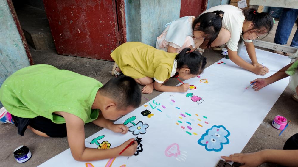 隨后的“共繪夏令營”活動中,志愿者與孩子們共同拿起畫筆創作長幅畫作,“望曦”“七朵有彩花”“快樂大本營”等元素在五彩顏料下綻放,每一筆都飽含留戀,大家圍繞長卷合影,定格協作的快樂與珍貴瞬間。