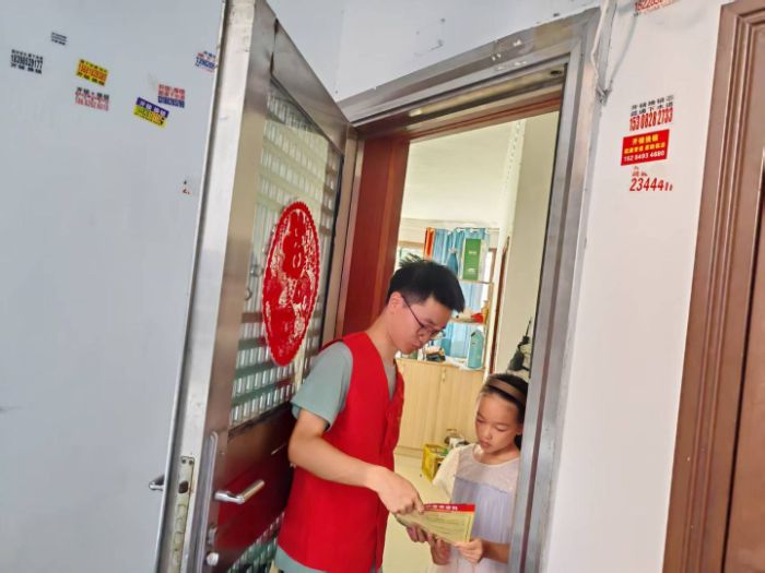 圖為百川匯安社會實踐隊隊員在入戶宣講防詐知識。賀瑜攝。